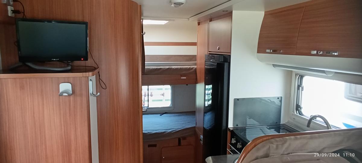 Con un interior espacioso y luminoso, su distribución optimizada permite alojar cómodamente a toda la familia. La cocina equipada incluye todo lo necesario para preparar tus comidas favoritas, mientras que el área de descanso garantiza noches tranquilas gracias a sus camas amplias y confortables. El baño completo con ducha independiente añade un extra de practicidad.